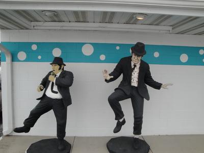 Braidwood is the home of the Polk-A-Dot Drive In, a 1950s diner featuring statues of James Dean, Marilyn Monroe, Elvis Presley and the Blues Brothers. Inside, it is well preserved with period photos. There are some tiny booths designed for children. The wallpaper has old Polka Dot menus. Hamburgers for 30 cents. Yikes! The Men's Room has about 50 Marilyn Monroe photos. No report on the Women's Room decor.
